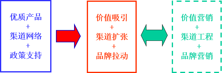 僑昌化學曾依賴產品、渠道及政策等做法獲得了成功,但這已為業內普遍采用,且隨著市場環境的快速改變,該模式漸漸失去競爭力。為適應企業未來大發展的需要,僑昌化學優化和升級了業務模式,采用“價值吸引+渠道擴張+品牌拉動”的“金鼎模式”來驅動制劑業務發展。新的業務模式以“品牌拉動”為核心,它統領“價值吸”和“渠道擴張”,而支撐該業務模式的營銷邏輯是“品牌營銷是龍頭,渠道工程是支柱,價值營銷為根基”,三足合力如一金鼎(如圖一所示),為僑昌化學的品牌營銷奠定了堅實基礎。